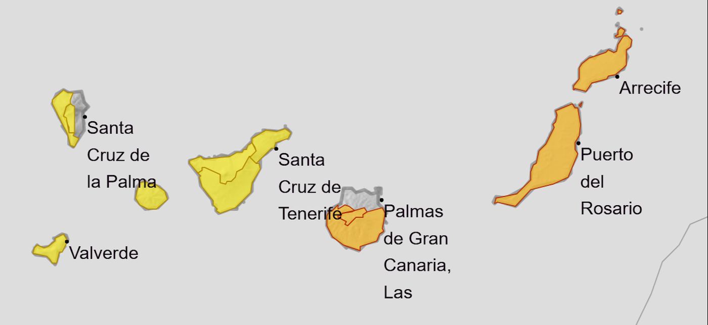 Oransje varsel for høy temperatur er utstedt for Kanariøyenes østlige provins Las Palmas, og gult for den vestlige provinsen, Santa Cruz de Tenerife.