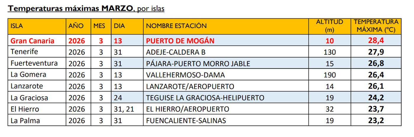 Den høyeste temperaturen som ble målt på Kanariøyene av Aemet i mars 2026 var 28,4 grader.